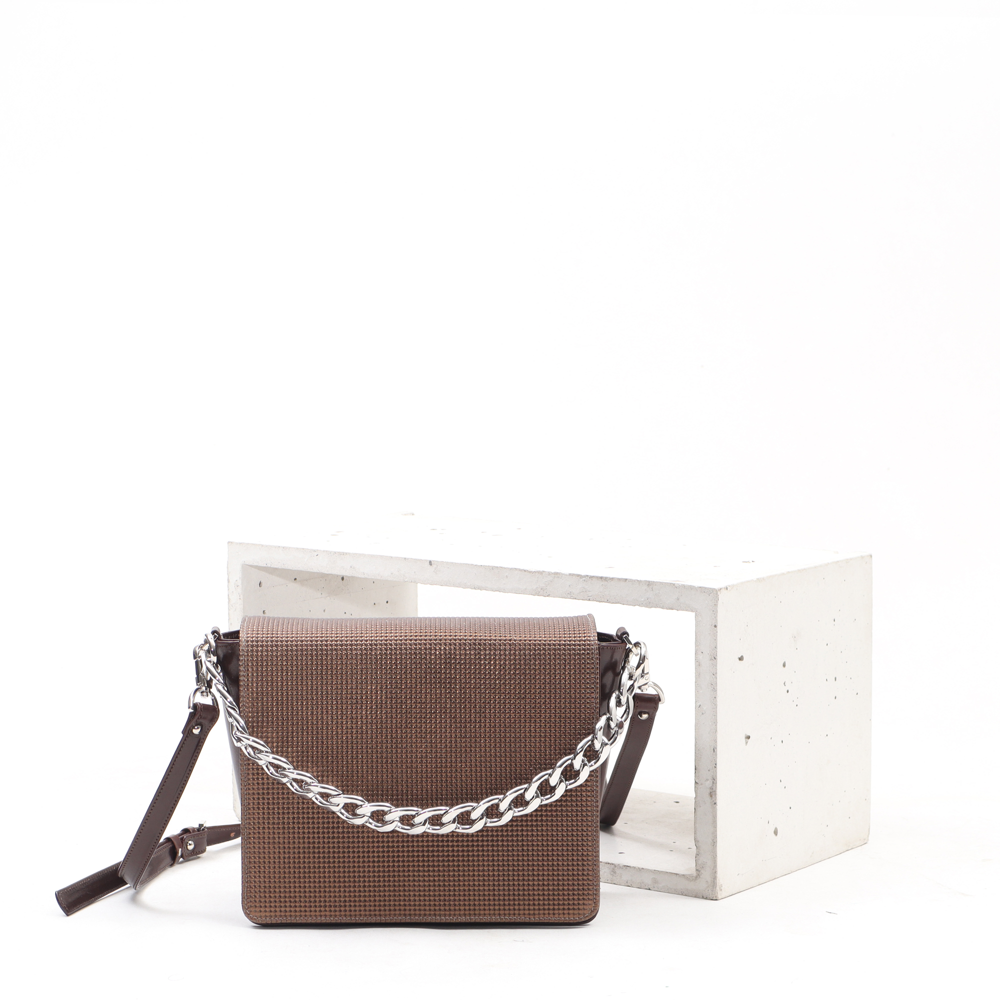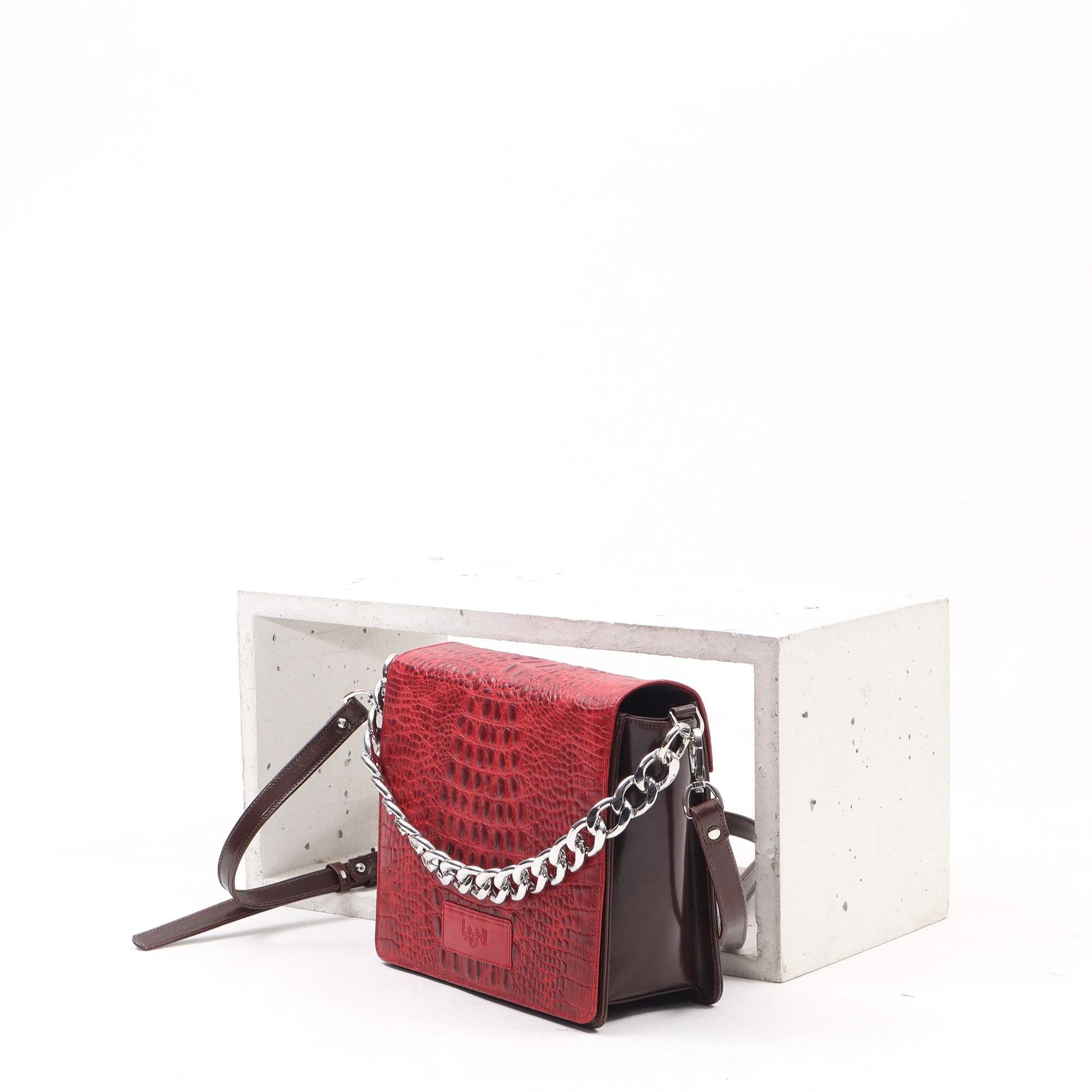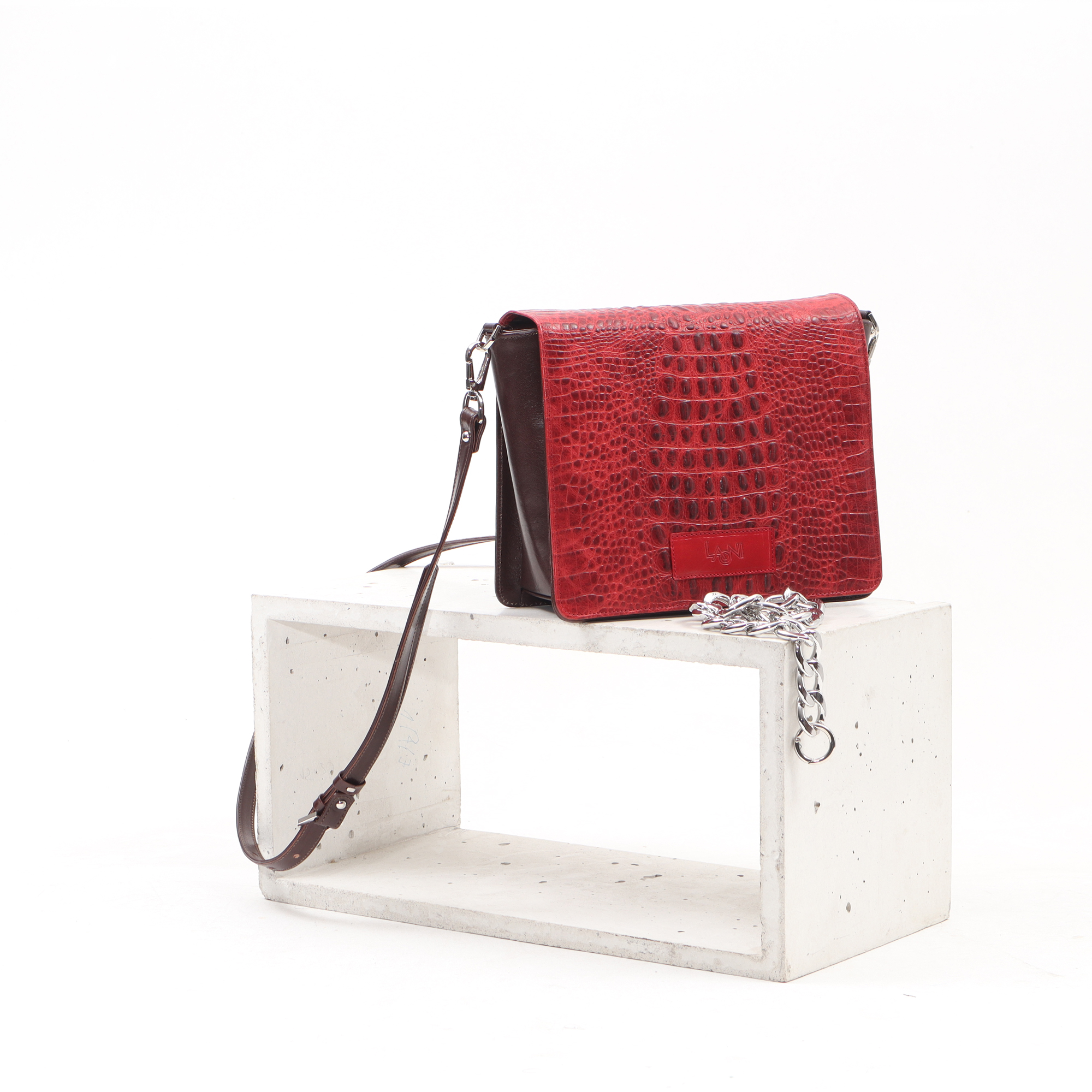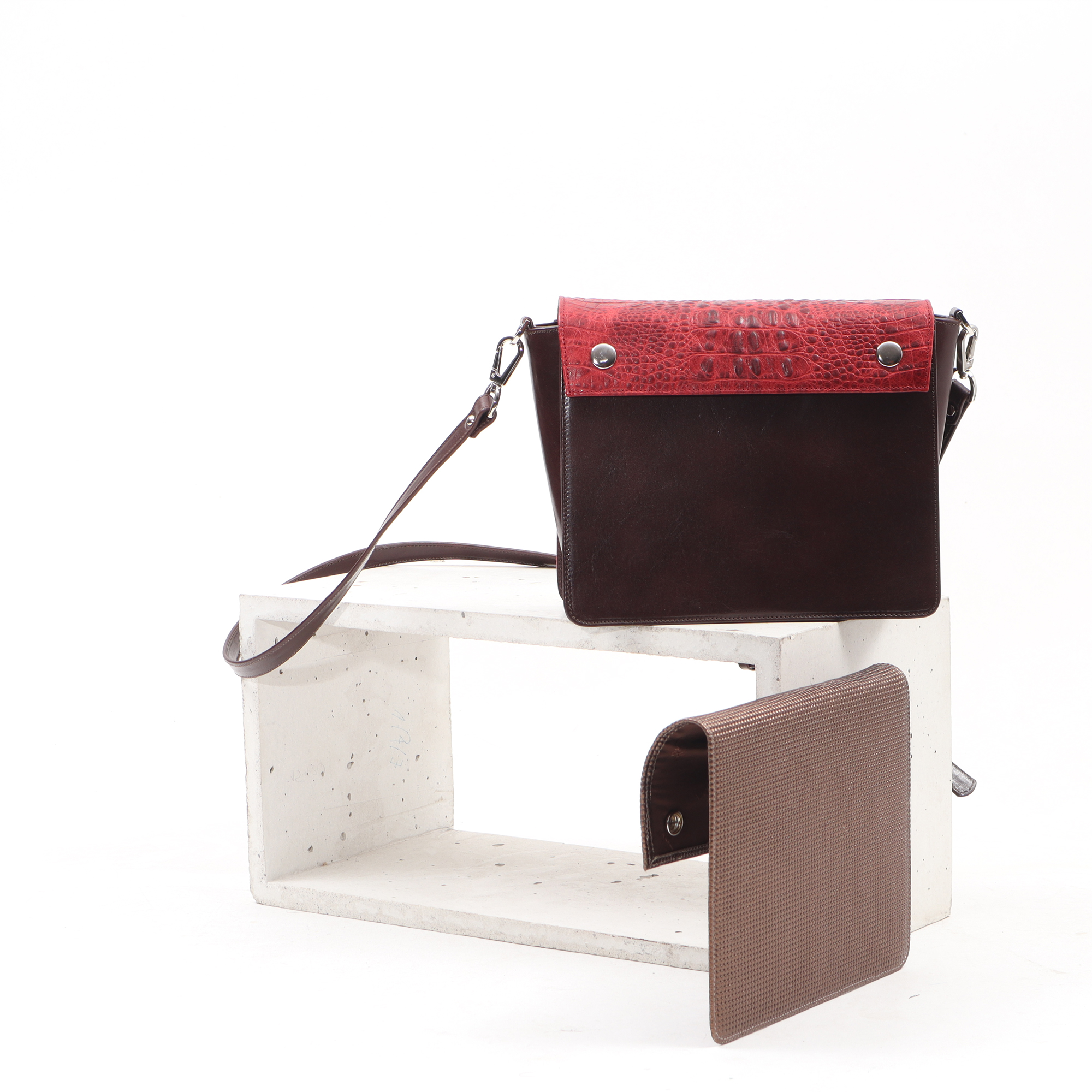 Színe: alaptáska: sötétbarna, fedelek: bronz dombornyomott minta és pecsétvörös dombornyomott croco